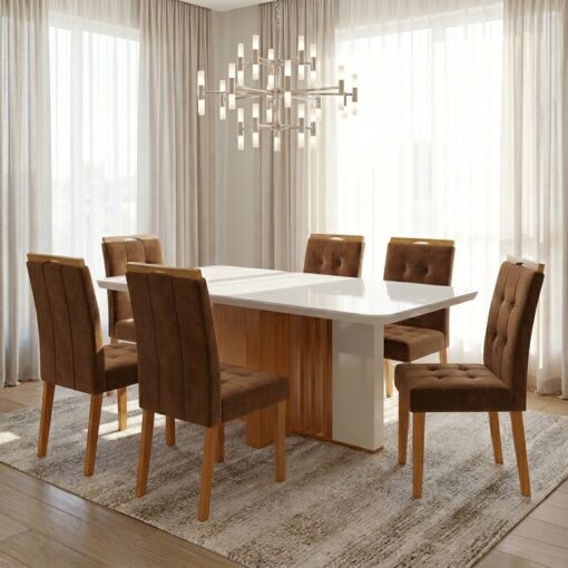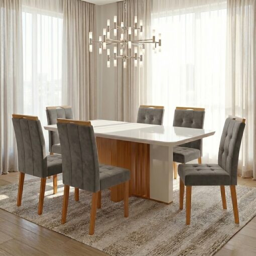 Mesa Astrid (Tampo Maxi) 170 Amêndoa Clean/Off White com 6 Cadeiras Sophia Veludo – LOPAS + WM DECOR