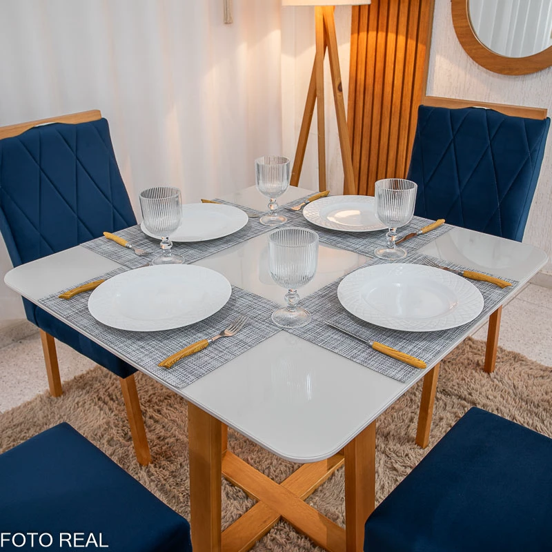 Mesa de Jantar Pedro 90×90 Vidro Off/Base Madeira + 4 Cad. Lisboa Veludo Azul 503 Madeira Art Assento – Entregue Montada