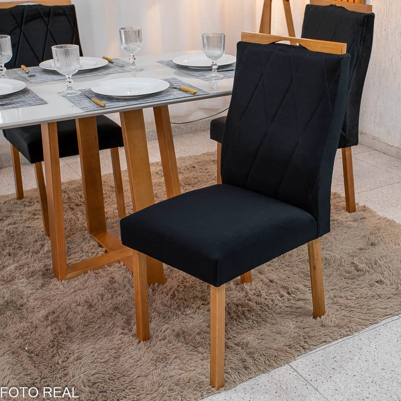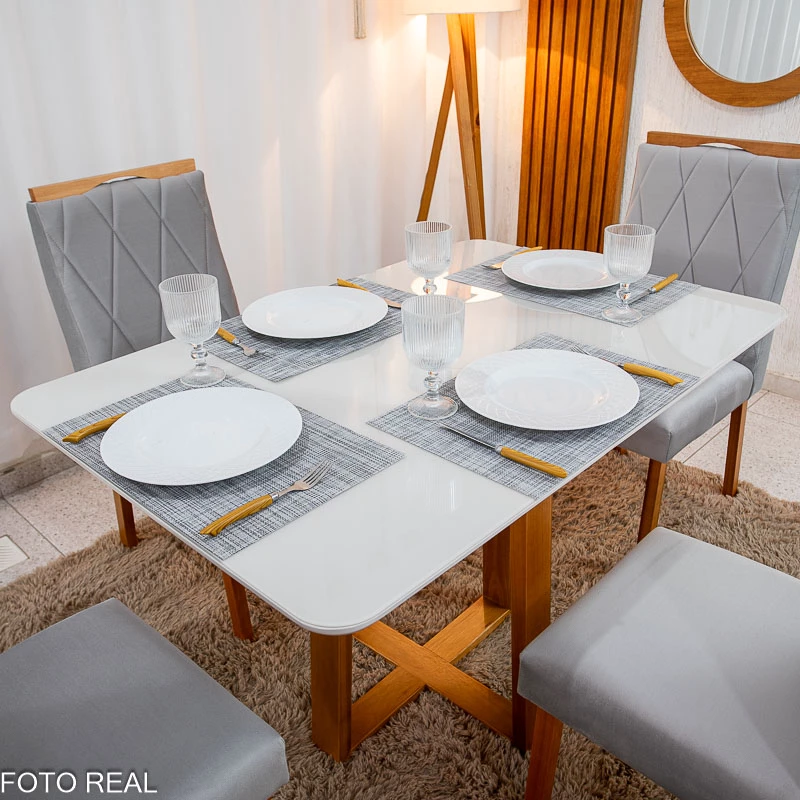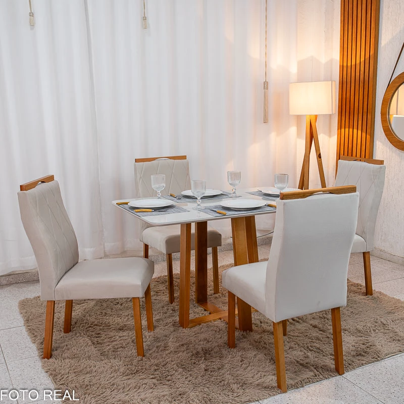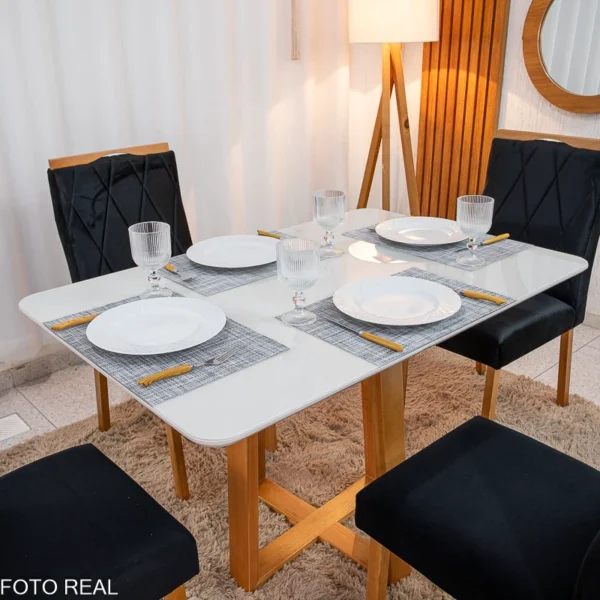 Mesa de Jantar Pedro Mel Vidro Off 120×80 4 Cadeiras Lisboa Veludo Madeira Maciça Art Assento – Entregue Montada
