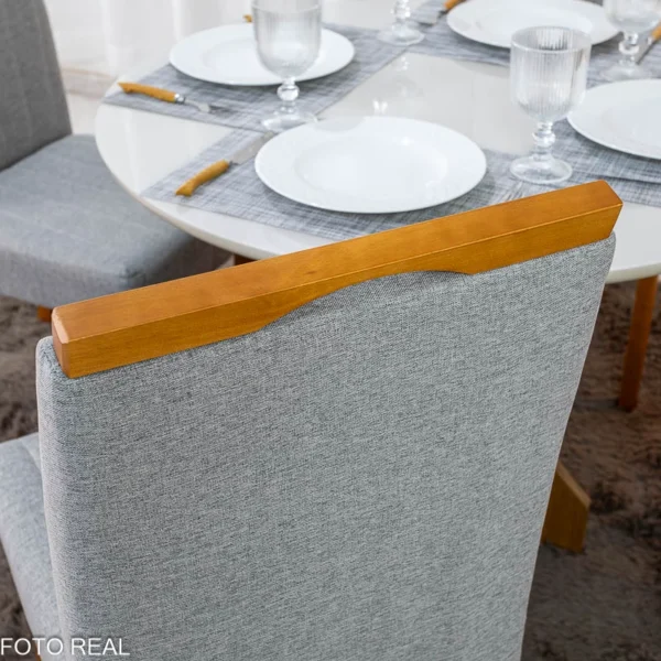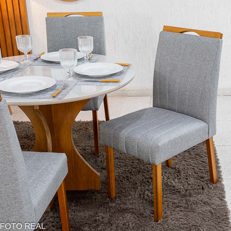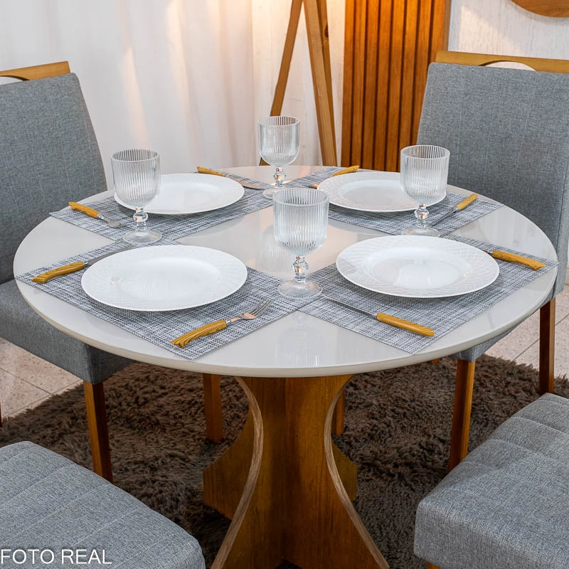 Mesa de Jantar Siena Redonda 100cm Vidro Off/Base Cinamomo – Minas Plac + 4 Cad. Isabela Linho Cinza 05 Madeira KM Decor – Entregue Montada