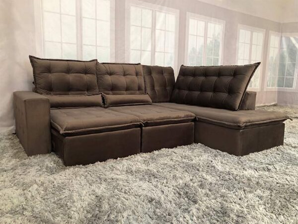 Encosto é reclinável com Chaise fixo, e espuma 100% fibra de silicone, almofadas com espuma Hipersoft 33 trazendo mais conforto para você na hora do descanso.
